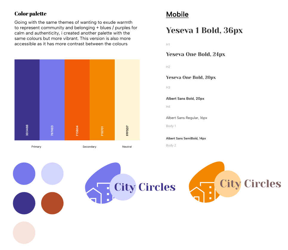 Alongside flows and wireframes, I also explored branding directions to make the experience feel modern and community-driven. I used a bold purple palette paired with clean typography to give City Circles a distinct but approachable identity. The visual system was designed to stand out from traditional guide apps and reinforce the idea of City Circles as a fresh, social space for newcomers.