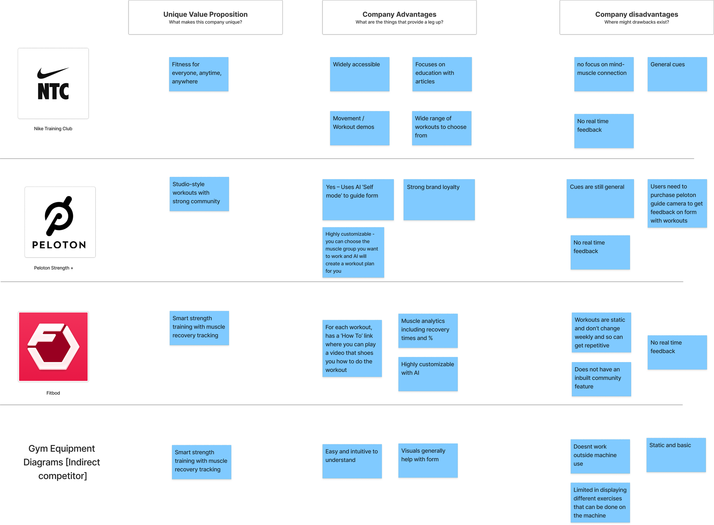 Interviews revealed that many beginners and intermediates struggle to know which muscles they should feel during workouts, especially with new or complex movements—leading to poor engagement, less effective workouts, and sometimes injury. Competitive analysis reinforced this gap, showing that existing fitness apps don’t provide lightweight, real-time solutions to guide users in the moment.