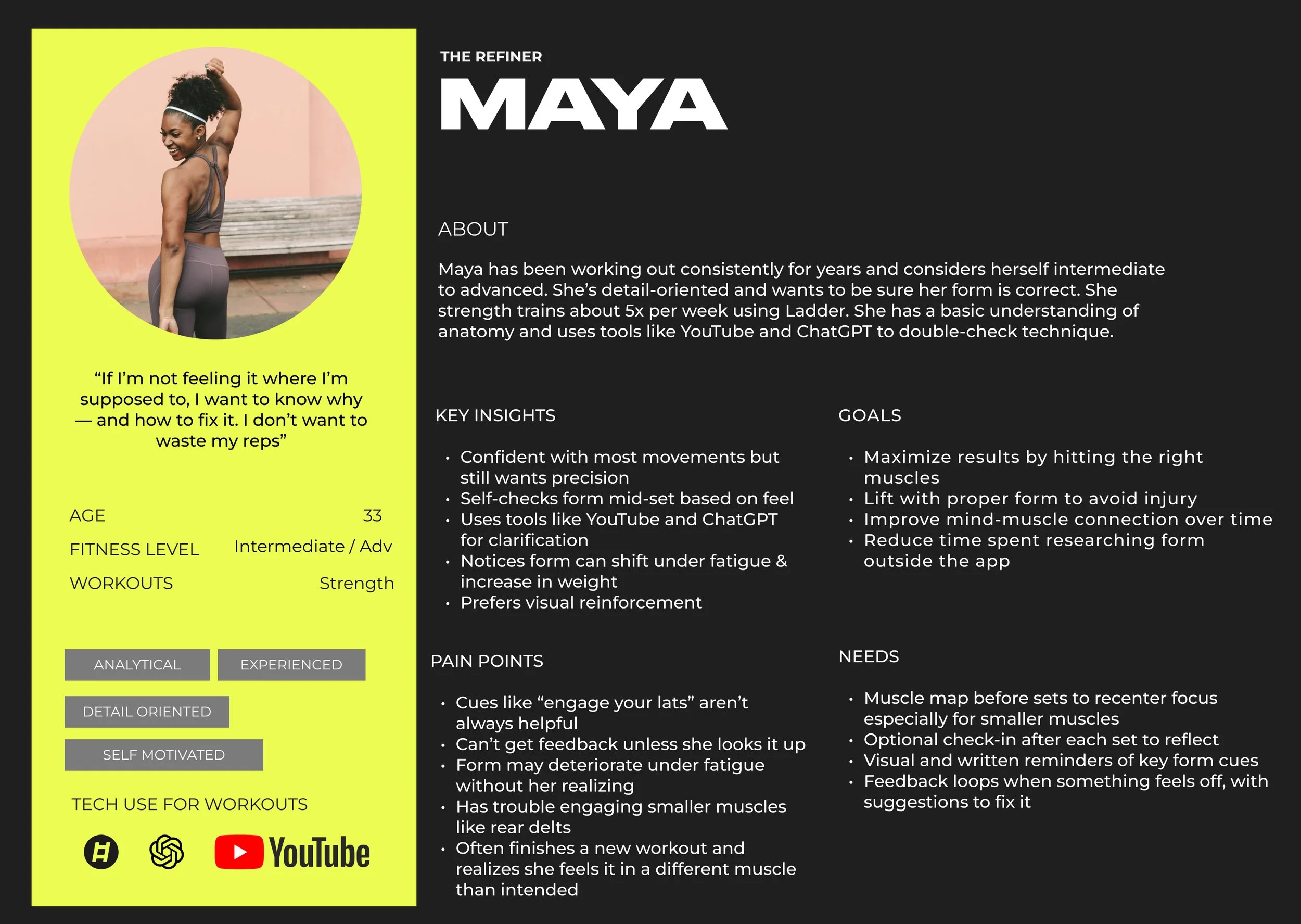 Maya, The Refiner: an intermediate-to-advanced user who trains regularly and knows the fundamentals. Her goal is to refine technique and confirm she’s activating the right muscles, particularly when tackling new movements. She prefers subtle reinforcement that integrates smoothly into her workout.